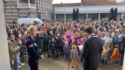 Burgemeester Rick Beukers was ronduit trots. Hij roemde Merels doorzettingsvermogen, haar enorme prestatie en de mooie reis die ze sinds haar jeugd heeft afgelegd richting het grootste wereldpodium.