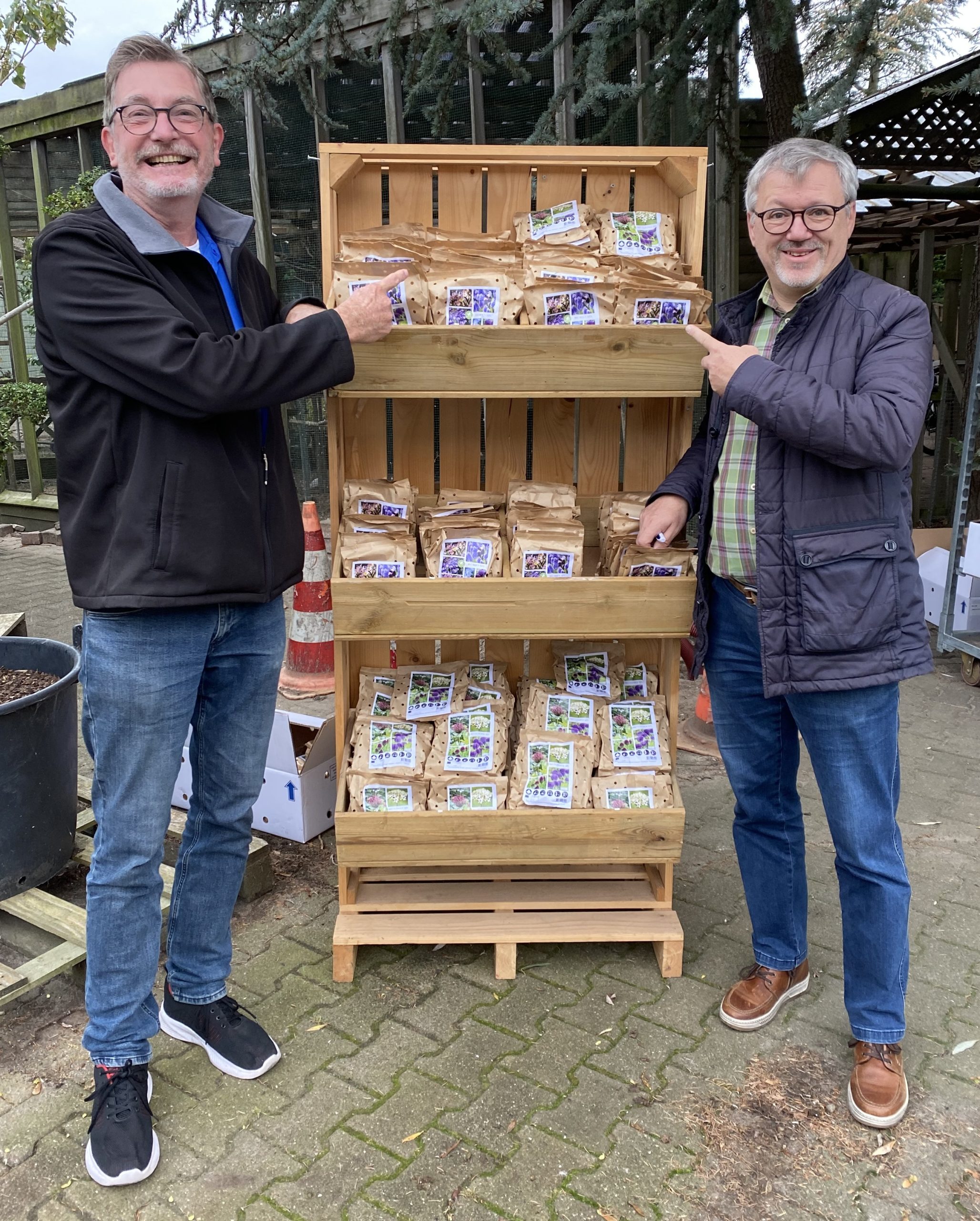 In oktober 2024 en 2025 konden inwoners bij tien uitdeelpunten in onze gemeente een gratis zakje biologische bloembollen halen. In twee jaar tijd hebben mensen 95.000 meerjarige bollen verspreid. Het doel is simpel”, zegt Hans Kes, de man achter het succes, “we willen de biodiversiteit in onze gemeente vergroten. En dat doen we samen met én voor zoveel mogelijk mensen.” Foto: Tom Lust en Hans Kes willen dit najaar weer een actie op touw zetten