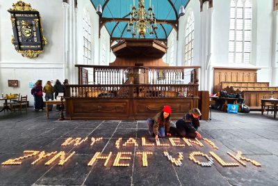 In de nogal koele kerk was het hard werken voor de veertig studenten Beeldende Kunst en Vormgeving aan de Breitner Academie in Amsterdam. In de Grote Kerk Oosthuizen presenteerden zij de uitwerkingen van een opdracht die deel uitmaakt van de opleiding tot bevoegd docent. Jaap Godrie, docent cultuurgeschiedenis, legt uit waarom de keus op deze kerk in Oosthuizen is gevallen: “Waar we in de kunstgeschiedenis vaak naar het verre kijken, hebben we juist gekozen voor verdieping van cultureel erfgoed in de regio waar veel studenten stagelopen en lesgeven.” Foto en tekst Yvonne Jonkman: Angelica Consejo Pinet en Sharon Houkema steken de waxinelichtjes aan die de tekst ‘Wij (allen) zijn het Volk’ weergeven