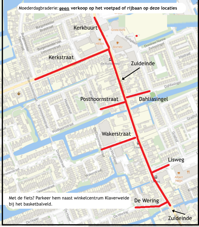 Tijdens de Moederdagbraderie mag u geen spullen verkopen op de openbare weg op de locaties hieronder. Ook het neerleggen van kleedjes is daar niet toegestaan: